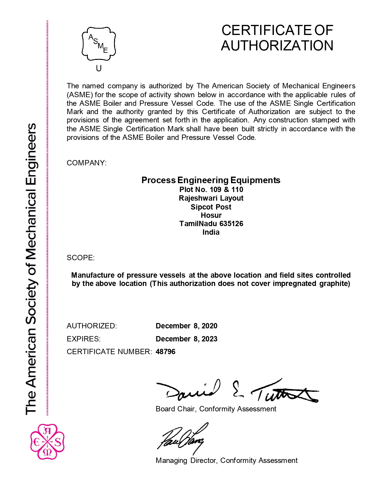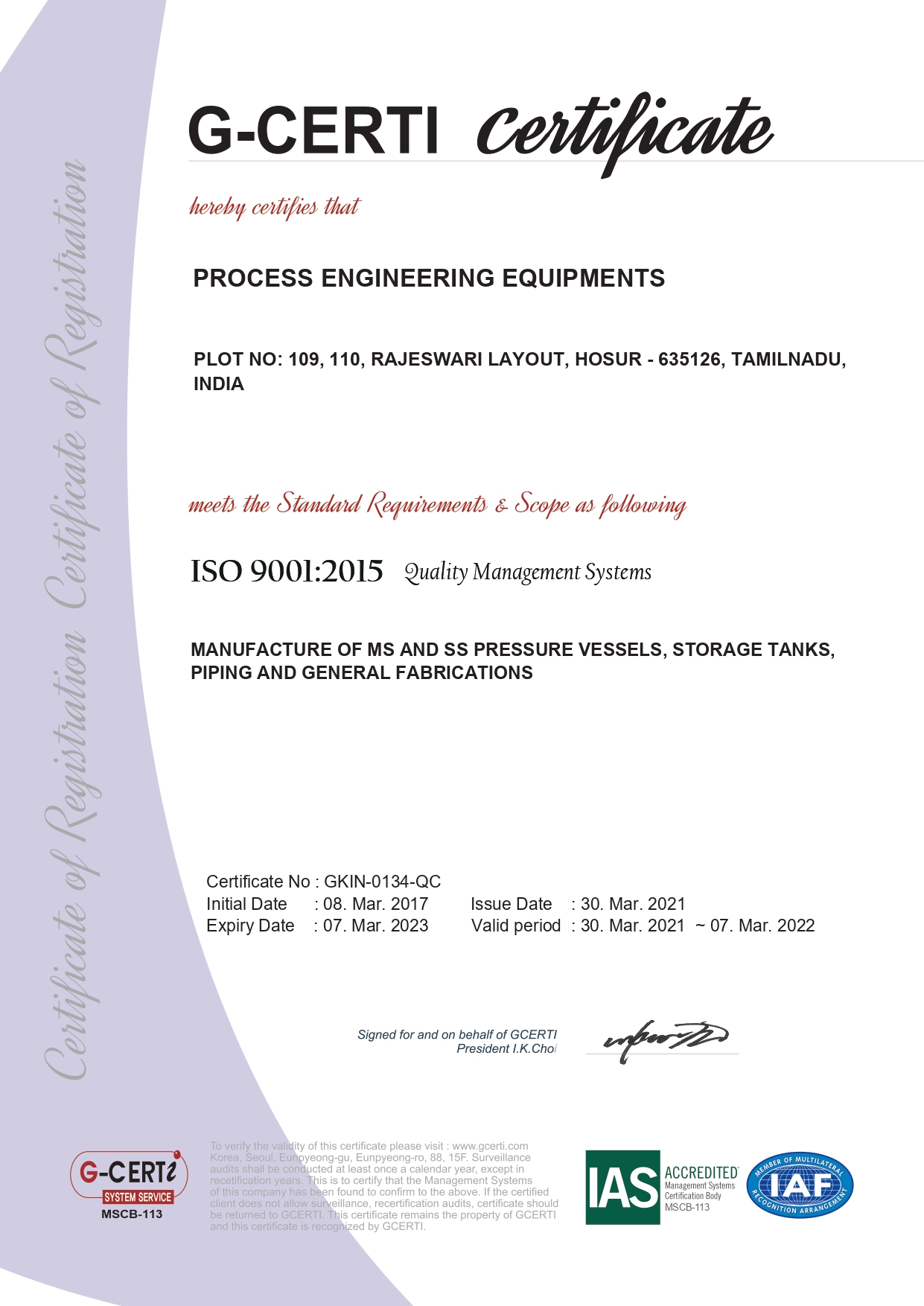 The “Process Engineering Equipments” are pleased to introduce ourselves as the ISO 9001- 2015 / ASME Certified Company and renowned design & Manufacturer of High quality Pressure Vessels , Electric Heater Vessels, Heat Exchangers, PED Equipments , Air receivers and similar fabricated equipments to serve the needs for Customers Oil & Gas, Petroleum Refineries, Chemical process industries, Water Treatment plant and Similar Industries.